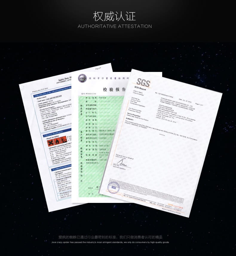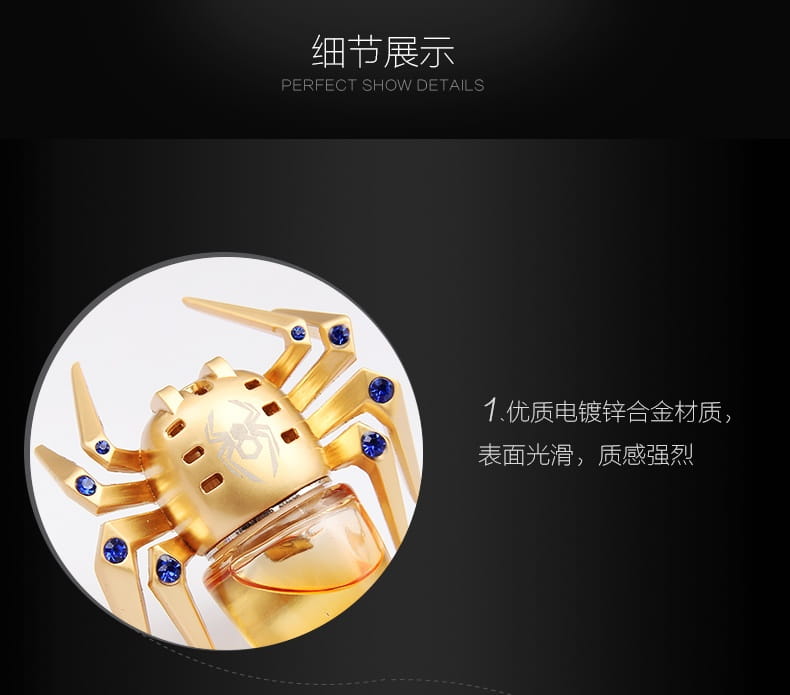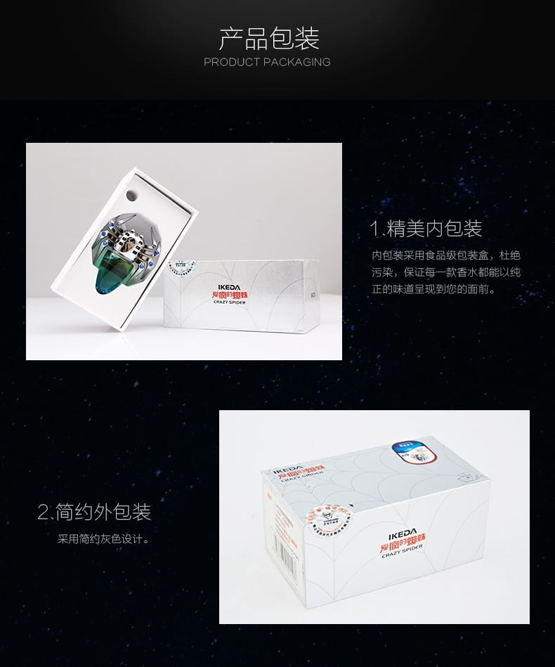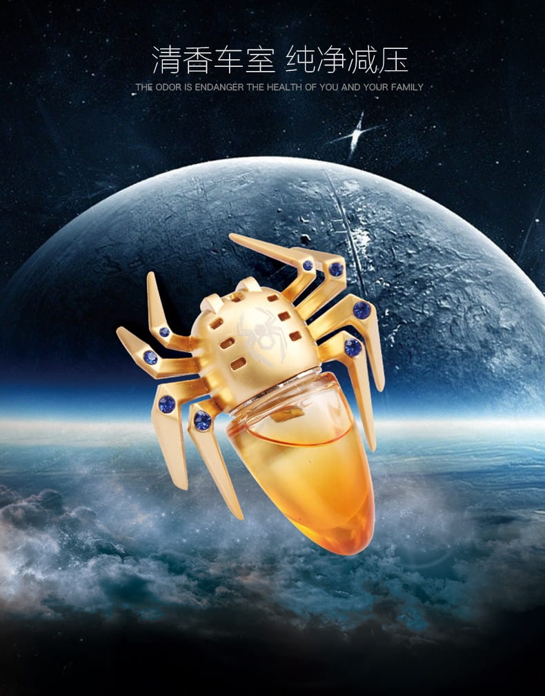 產(chǎn)品特點(diǎn):1、靈活生動(dòng),極愛廣大男生、女生的喜愛;2、蜘蛛個(gè)性造型,配以繩子夾子,趴在出風(fēng)口,活靈活現(xiàn);3、高檔鋅合金 富有質(zhì)感金屬光澤,有份量,有手感,更顯身份與價(jià)值;4、鑲嵌8顆進(jìn)口比利時(shí)安特衛(wèi)普鉆,光澤透亮,閃耀迷人;5、香精100%法國(guó)進(jìn)口,香味獨(dú)特迷人,持香時(shí)間長(zhǎng),質(zhì)量有保證;6、品牌專利產(chǎn)品,只此一家;7、可插于汽車內(nèi)、辦公室空調(diào)出風(fēng)口處,芳香除臭抑菌,更是賞心悅目的美麗風(fēng)景。